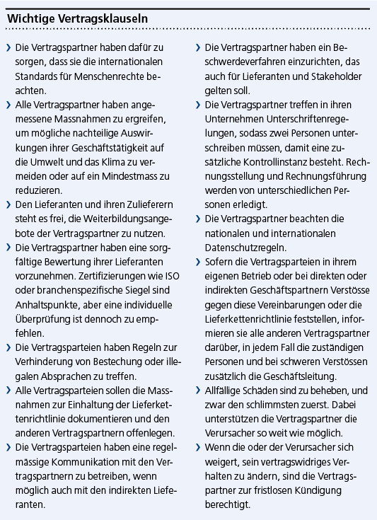 Vertragliche Zusicherungen, dass die Lieferkettenrichtlinie befolgt wird, sind von direkten, aber auch von indirekten Geschäftspartnern einzuholen (Artikel 10). In Vertragsklauseln sind geeignete Überprüfungsmöglichkeiten zu vereinbaren. Wenn sich negative Auswirkungen nicht beseitigen lassen, soll man die Geschäftsbeziehungen abbrechen (Artikel 10).