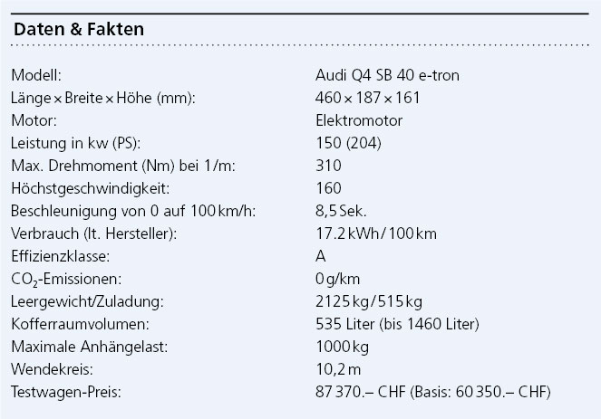 Bis vor nicht langer Zeit galt die Reichweitenproblematik noch häufig als K.-o.-Faktor für den Kauf elektrisch betriebener Fahrzeuge. Dieses Argument dürfte so keinen Bestand mehr haben. Vor allem entscheiden die Batteriegrösse und der Verbrauch über die Reichweite. In allen Varianten des Q4 e-tron ist eine Batterie verbaut, die 77 kWh Energie netto (brutto 82 kWh) vorhält. Die vom Werk angegebenen Verbrauchswerte im Q4 40 e-tron liegen bei 17,1kWh/100 km. So sollte die Ladekapazität erst nach rund 500 Kilometern aufgebraucht sein.