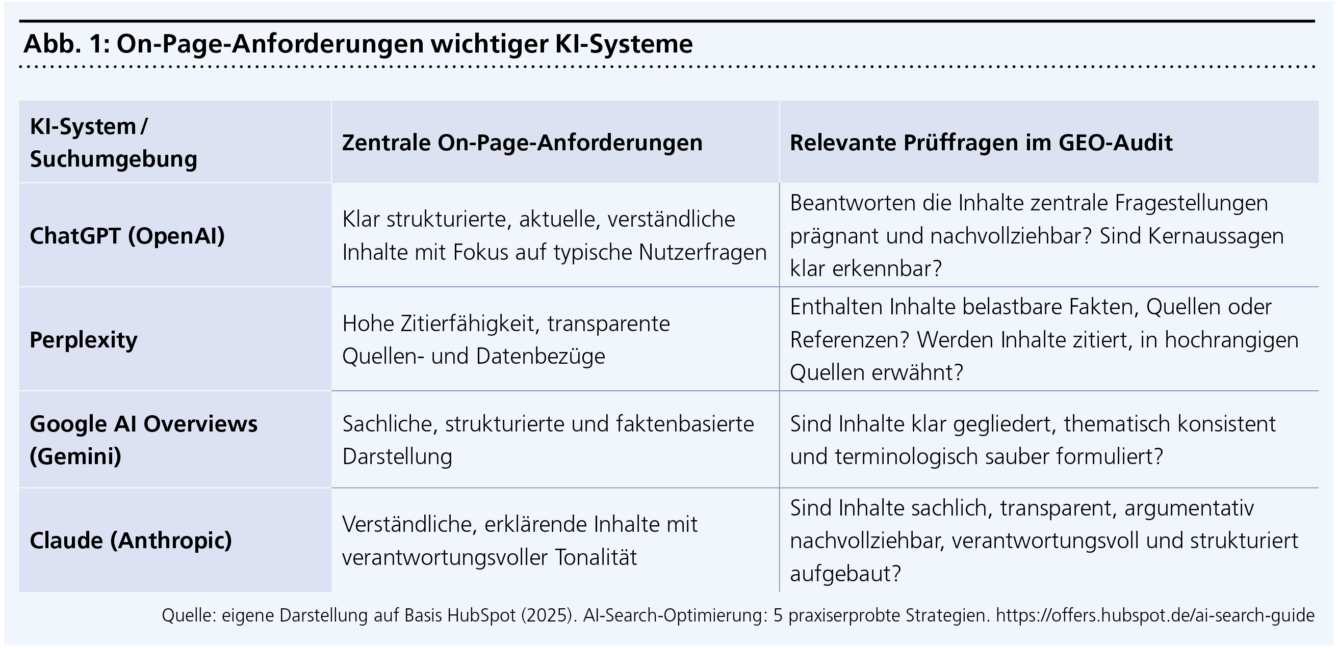 Da KI-basierte Suche von mehreren Systemen mit unterschiedlicher Logik geprägt ist, sollte die On-Page-Analyse plattformübergreifend erfolgen. Im Fokus steht dabei, ob Inhalte unabhängig vom jeweiligen KI-System als verständliche und zitierfähige Wissensquelle genutzt werden können. Abbildung 1 gibt einen Überblick über zentrale On-Page-Anforderungen gängiger KI-Systeme und die daraus abgeleiteten Prüffragen für das GEO-Audit.