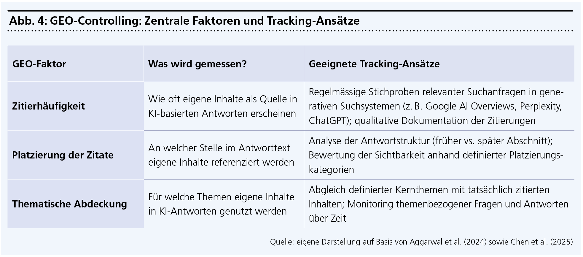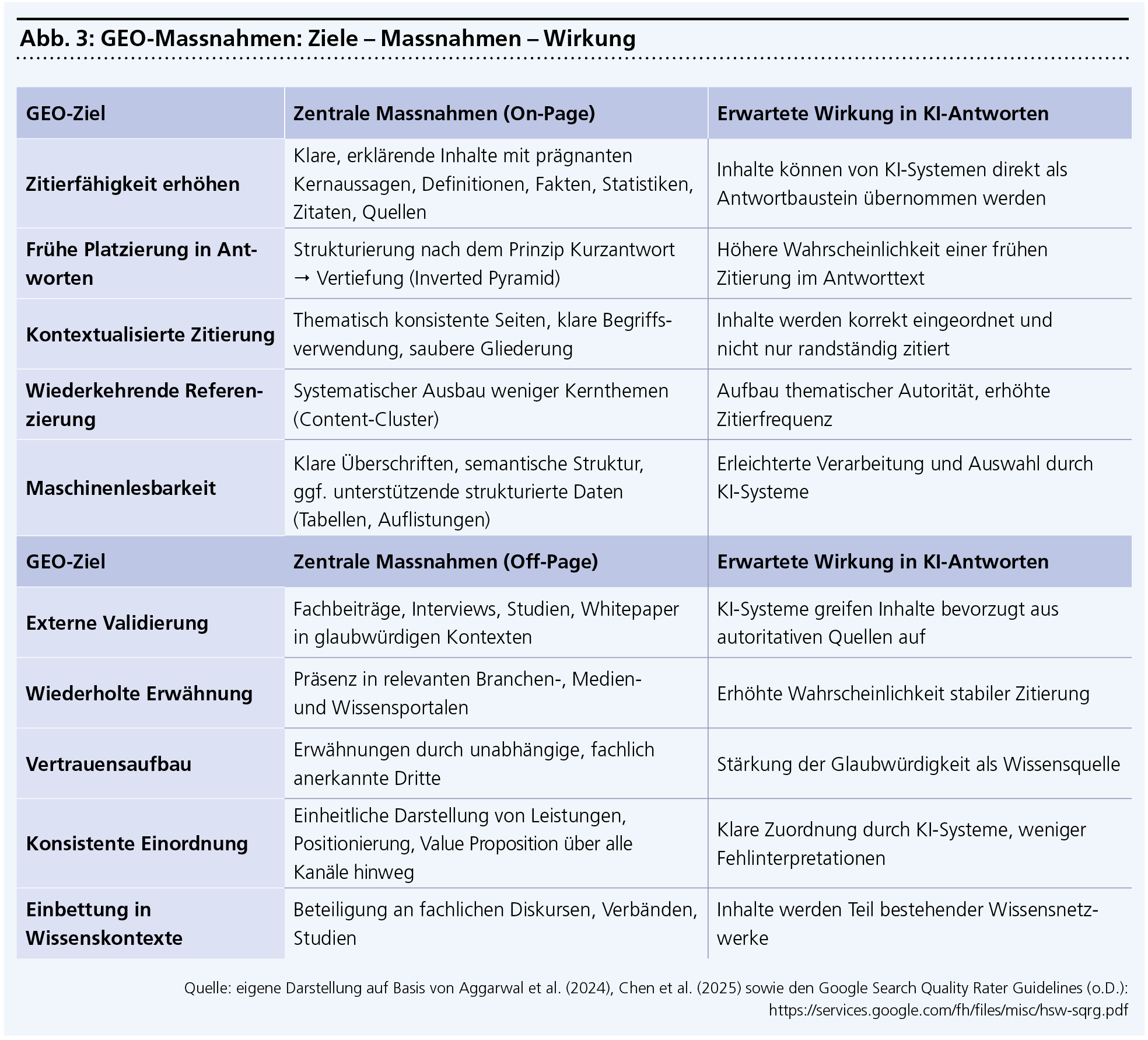 Die Fachliteratur verwendet den Begriff GEO bislang nicht einheitlich. Während einige Ansätze primär die Optimierung der eigenen Website betonen (vgl. Aggarwal et al., 2024), beziehen andere auch externe Referenzen und Erwähnungen ein (vgl. Chen, et al., 2025). Für KMU ist diese Unterscheidung praxisnah: Wie bei SEO lassen sich auch bei GEO On-Page- und Off-Page-Ansätze unterscheiden, die gemeinsam zur Sichtbarkeit in KI-Systemen beitragen.