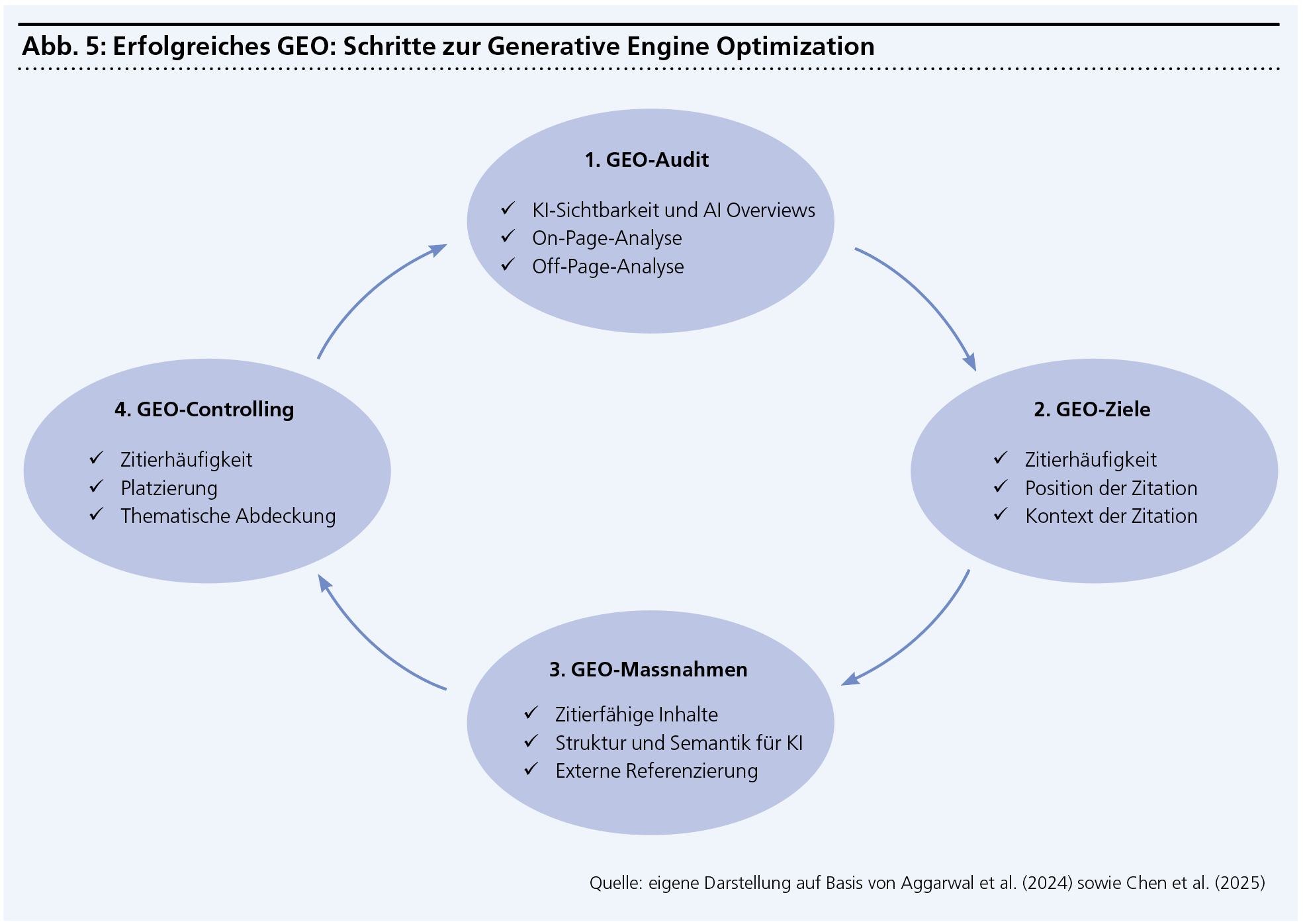 Für die Praxis empfiehlt sich daher die Orientierung an einem klaren Vorgehensrahmen: Ausgangspunkt bildet ein GEO-Audit zur Standortbestimmung. Darauf aufbauend werden konkrete GEO-Ziele definiert, gezielte GEO-Massnahmen abgeleitet und durch ein geeignetes Controlling begleitet.