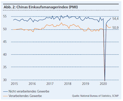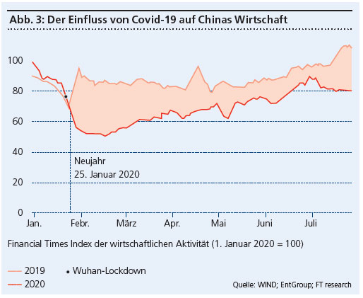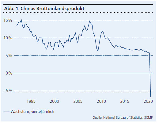 Zum ersten Mal seit der Öffnung Chinas vor 40 Jahren bekamen die chinesischen Bürger Negativwachstum zu spüren: –6,2 Prozent im ersten Quartal 2020 im Jahresvergleich. Die Regierung reagierte mit zahlreichen Initiativen, um den Fall abzubremsen. Staatliche Banken boten grossen Unternehmen neue Kredite und reduzierte Zinsen, wobei der niedrigste Kreditzinssatz für Firmen immer noch bei 4,35 Prozent liegt. Um kleinere Firmen zu unterstützen, wurden die Sozialabgaben für Angestellte von KMU bis Ende 2020 erlassen.