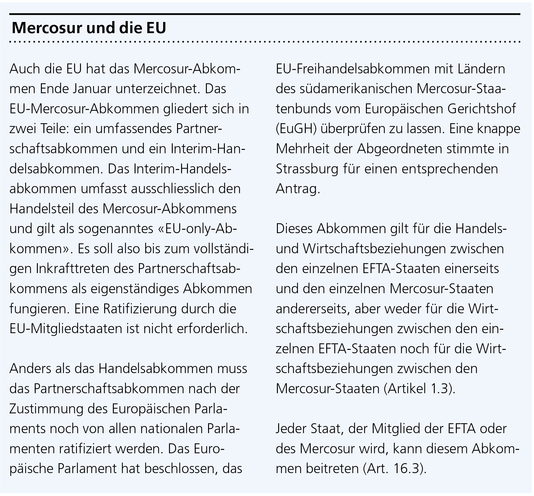 Die EFTA- und Mercosur-Staaten haben die Verhandlungen über ein Freihandelsabkommen am 2. Juli 2025 nach acht Jahren abgeschlossen und dieses am 16. September 2025 unterzeichnet. Die Vertragspartner von Mercosur sind die Staaten Brasilien, Argentinien, Uruguay und Paraguay. Diese sind mit 270 Millionen Einwohnern schon ein wichtiger Zielmarkt mit grossem Wachstumspotenzial für die Schweizer Exportwirtschaft.