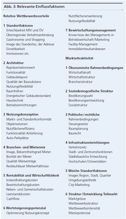 Je nach Wirtschaftsregion und Standortqualität bestimmen die angestrebte Kostensenkung, die Optimierung des Flächenbedarfs und der Raumprogramme und die Standortkonzentration die Nachfrage unterschiedlich stark. In etlichen Wirtschaftsregionen besteht hartnäckiger Angebotsüberhang und damit ein hart umkämpfter Markt. Diese Entwicklungen signalisieren in aller Deutlichkeit die limitierten Wertwachstumspotenziale für Dienstleistungs- sowie Bürogebäude im diversifizierten Anlage-Portefeuille. Wer im Anlage-Teilmarkt Bürohäuser eine angemessene Performance-Entwicklung sichern will, muss genauer analysieren, um potenzielle Chancen und Risiken rechtzeitig erkennen zu können; eine grosse Herausforderung für das strategische und operative Management.
