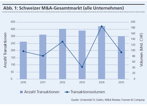 Ein aussagekräftiges Bild zu den Trends im Gesamtmarkt (alle Unternehmensgrössen) vermittelt die M&A Database der Universität St. Gallen (Berücksichtigt sind M&A-Deals mit einem Transaktionswert über 7 Millionen US-Dollar oder, bei nicht bekanntem Transaktionswert, einem Umsatz von mindestens 14 Millionen US-Dollar des Ziel-Unternehmens). Gemäss neuesten Erhebungen sind die Transaktionsvolumina im Jahr 2015 um 55 Prozent im Vergleich zum Rekordjahr 2014 gesunken (vgl. Grafik 1). So hatten Transaktionen mit Schweizer Beteiligung (Käufer oder Verkäufer mit Sitz in der Schweiz) einen Gesamtwert von 84,9 Milliarden US-Dollar (2014: 188,1 Mrd. USD, davon 39,9 Mrd. die Lafarge/Holcim-Fusion). Die Anzahl der Transaktionen ging mit 17 Prozent gegenüber dem Vorjahr ebenfalls etwas zurück.