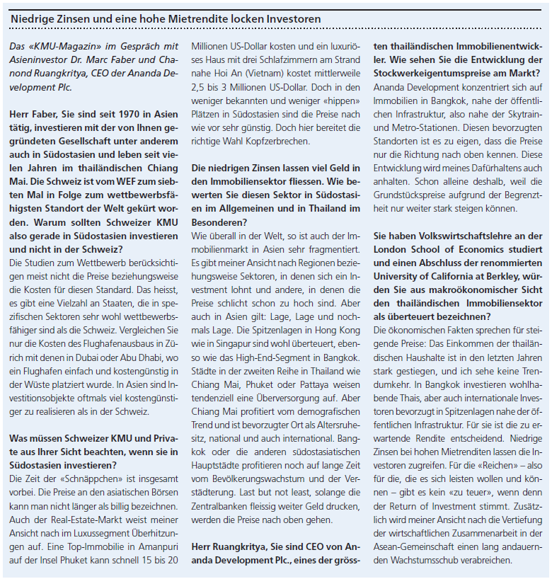 Die Immobilienpreise in Thailand – speziell in Bangkok und Chiang Mai – sind in den letzten zehn Jahren im Schnitt um neun Prozent gestiegen. Die Entwicklung hat sich aber zuletzt auf etwa sechs Prozent Preiswachstum abgeschwächt. Wie in vielen anderen Ländern erhalten die Real-Estate-Investitionen von den niedrigen Zinsen der Zentralbanken Rückenwind. Darum sind alleine im Jahr 2013 mehr als 34 000 Eigentumswohnungen im Grossraum Bangkok erstellt worden und neue Hochhäuser säumen die Linien des Skytrain und der Metro der 8,5-Millionen-Metropole.