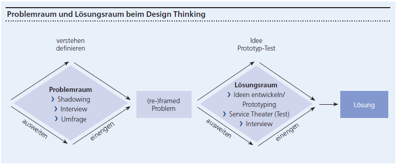 Sobald die Informationen und Daten im Problemraum erhoben sind, geht es in die nächste Phase des Design-Thinking-Prozesses: in den Lösungsraum. In dieser Phase werden die ausgearbeiteten Ideen weiter konkretisiert. Hierbei geht es darum, mittels der erfassten Daten Ideen auszuarbeiten und diese mit Prototypen zu veranschaulichen und zu testen. Eine Methode, welche sich zum Testen von Prototypen eignet, ist das Service Theater.Beim Service Theater wird innerhalb eines Rollenspiels beispielsweise ein Kundengespräch imitiert. Dabei nimmt mindestens eine Person die Rolle des Kunden und die andere Person die des Verkäufers (Serviceanbieter) der neu entwickelten, datenbasierten Dienstleistung ein. Beide Rollen können durch den Serviceanbieter gespielt werden. Es empfiehlt sich jedoch, den wirklichen Kunden zu integrieren. Im Kundengespräch getestet werden die Verkaufsargumentation mit dem Wertangebot, den Verkaufsunterlagen sowie der Prototyp (zum Beispiel ein «Clickable Dummy»).