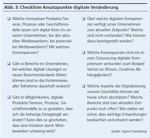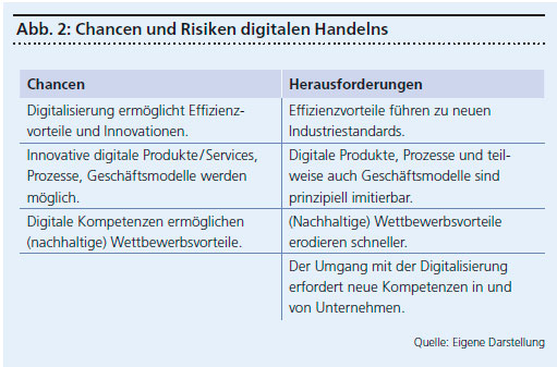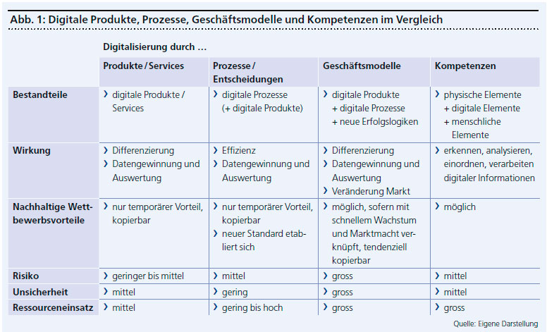 Für Unternehmen geht es unter anderem um vier grosse Ansatzpunkte: digitale Produkte und Services, digitale Prozesse und Entscheidungen, digitale Geschäftsmodelle (siehe auch Matzler et al., 2016; Porter & Heppelmann, 2014, 2015) sowie digitale Kompetenzen. Jede dieser Massnahmen erfordert ein unterschiedliches Ausmass an Aufwand, und auch die Möglichkeit, (nachhaltige) Wettbewerbsvorteile zu erzielen, unterscheidet sich.