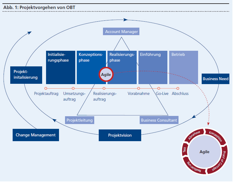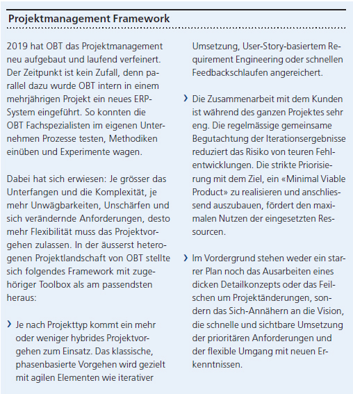 Für die hochkomplexen Projekte von heute reichen diese nicht mehr. Weil jeder Unternehmensbereich vom anderen abhängig ist, können die verschiedenen Arbeitsfelder wie Finanzen, Lager oder Auftragsabwicklung nicht mehr mit je einer Applikation abgedeckt werden. «Dadurch sind nicht nur wir als Anbieter gefordert, auch für die Kunden ist es fast unmöglich, die Anforderungen in der Anfangsphase eines Projekts vollständig, detailgetreu und unter Berücksichtigung aller Abhängigkeiten zu definieren», konstatiert Christophe Zuber, Leiter Projektmanagement Informatik KMU Markt Zürich bei OBT.