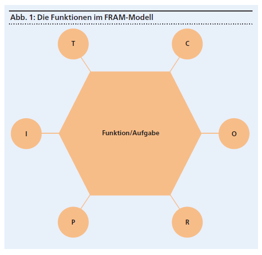 Das Feld des Prozessmanagements bietet hierfür einige klassische Prozesserhebungs-Methoden. Im Forschungsprojekt «Datenbasierte Dienstleistungen nachhaltig umsetzen» wurde jedoch gezielt ein neuer Ansatz gewählt, der zur Analyse von komplexen soziotechnischen Systemen entwickelt wurde: Functional Resonance Analysis Method, oder kurz FRAM. Kern dieser Methode stellen die «Funktionen» mit ihren sechs «Aspekten» dar (vgl. Abbildung 1).