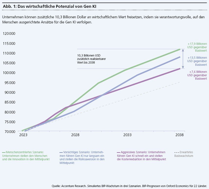 Die proaktive und vor allem verantwortungsvolle Einführung von Gen KI kann bis 2038 global zusätzliche wirtschaftliche Werte in Höhe von 10,3 Billionen US-Dollar freisetzen.