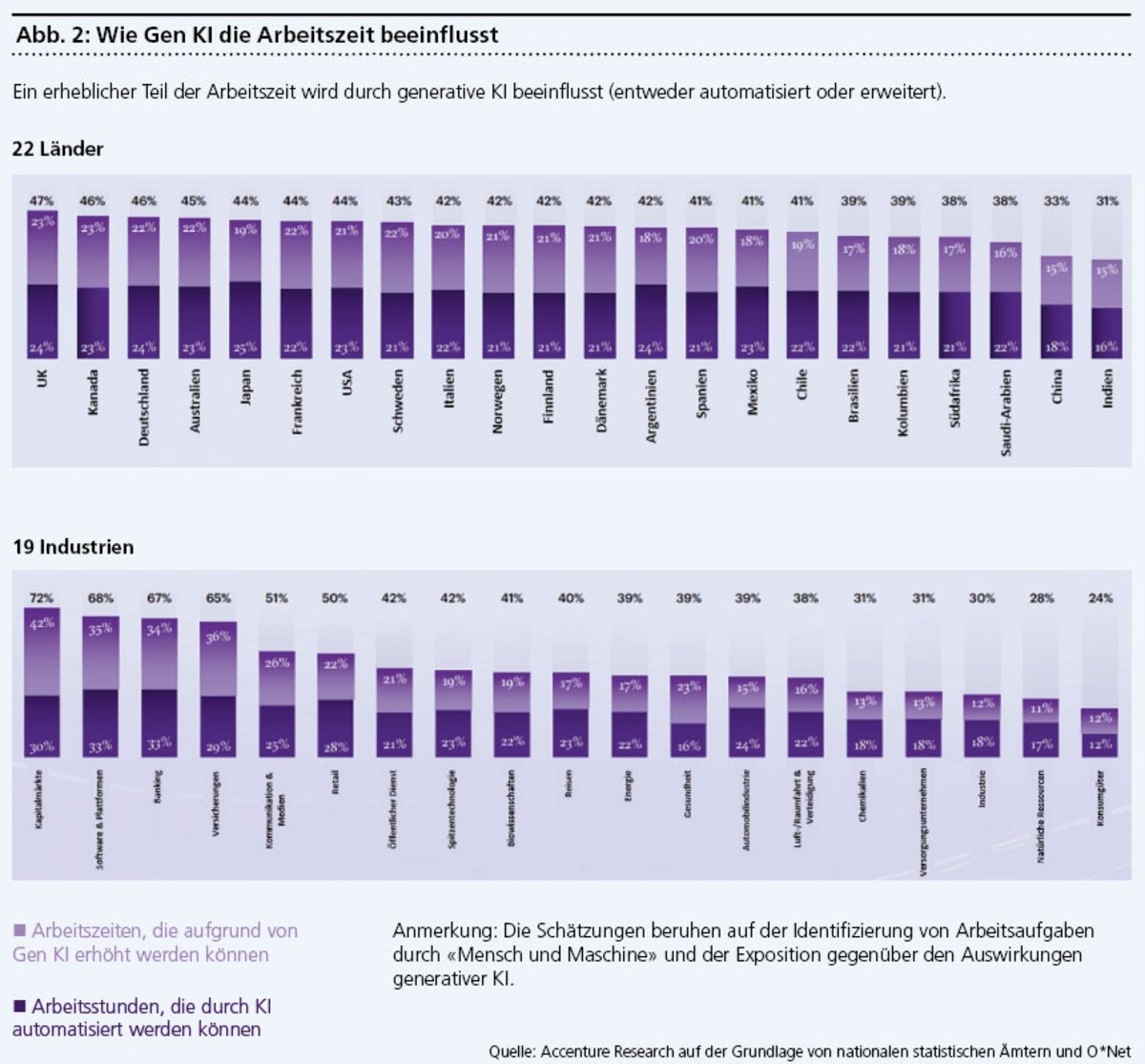 Die geschäftliche Aufwärtsentwicklung ist ebenso vielversprechend. Ein aktueller Bericht des Beratungsunternehmens Accenture zeigt, dass ein grosser Anteil der Führungskräfte zuversichtlich ist, dass Gen KI zur Steigerung der Marktanteile ihrer Unternehmen beitragen wird. 17 Prozent der Führungskräfte rechnen sogar mit einer Marktanteilssteigerung von mindestens zehn Prozent durch Gen KI. Darüber hinaus können Unternehmen, die bei ihrer Umstrukturierung und Integration von KI führend sind, in den nächsten drei Jahren Produktivitätssteigerungen von 20 Prozent oder mehr erwarten. In der Schweiz, wo bereits viele Unternehmen in KI investieren, könnten solche Produktivitätssteigerungen einen erheblichen Einfluss auf das Wirtschaftswachstum haben.