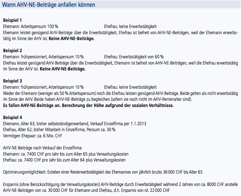 Eine Besonderheit ist für Ehepaare zu beachten: Grundsätzlich unterliegen beide Ehegatten der AHV-Beitragspflicht. Ist aber ein Ehegatte erwerbstätig im Sinne der AHV, so ist der nichterwerbstätige Ehegatte von der Beitragspflicht befreit. Erwerbstätig im Sinne der AHV heisst: mindestens 50 Prozent Erwerbstätigkeit während mindestens neun Monaten im Jahr oder AHV-Beiträge durch die Erwerbstätigkeit (Arbeitnehmer und Arbeitgeber) belaufen sich auf mehr als 50 Prozent der berechneten AHV-NE-Beiträge. Aus dem Erwerbseinkommen sind mindestens Beiträge von 950 CHF abzurechnen (doppelter Mindestbeitrag). Beispiel: Ehemann arbeitet voll, Ehefrau führt den Haushalt und geht keiner Erwerbstätigkeit nach. Sobald aber der erwerbstätige Ehegatte sein Arbeitspensum reduziert oder beendet (z. B. durch Frühpensionierung, Firmenverkauf etc.), fallen AHV-NE-Beiträge an. Wenn beide Ehepartner noch nicht im Rentenalter sind, fallen die AHV-NE-Beiträge zwei Mal an. Auch wenn eine Ehe durch Tod oder Scheidung aufgelöst wird, ist stets ein Augenmerk zu richten, ob nun für einen Ehepartner AHV-NE-Beiträge anfallen (z. B. für eine Witwe ohne Erwerbstätigkeit).