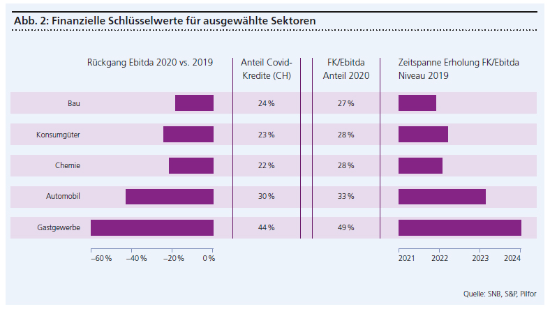 Gemäss Analysen von Pilfor verzeichneten im Durchschnitt viele Schweizer Unternehmen bereits seit 2018 einen kontinuierlichen Anstieg des Verschuldungsgrades. Dieser erfolgte teils aufgrund von höheren Dividenden, Aktienrückkäufen, Investitionen und Akquisitionen, teils aufgrund nachlassender operativer Finanzergebnisse. Die unvorhersehbare Kombination massiv einbrechender Umsätze und Margen in Kombination mit dem zusätzlichen Aufbau von Finanzschulden zur Kompensation wegfallender Gewinne akzentuierte den Anstieg des Verschuldungsgrades massiv. So ergab sich selbst für resistentere Sektoren eine zusätzliche Fremdkapital-(FK-)/Ebitda-Verschuldung von 1,2× bis 1,5×, für weniger resistente gar bis zu 5× und darüber. Folglich zeichnet sich damit eine nur sehr schleppende Rückführung der Verschuldung auf das Niveau von 2019 ab, die in manchen Sektoren wie dem Gastgewerbe oder der Aviatik bis 2024 und darüber hinaus andauern dürfte.