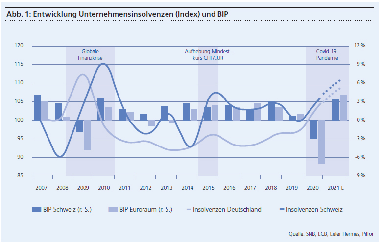 Abbildung 1 macht deutlich, wie sich wirtschaftliche Krisen auf die Entwicklung von Unternehmen auswirken: Während als Folge der globalen Finanzkrise 2008 die Unternehmensinsolvenzen zunahmen, war dies besonders für Schweizer KMU nach der Aufhebung der Wechselkursuntergrenze 2015 erneut der Fall. Obschon 2020 die Zahl der Konkurse dank massiver staatlicher Massnahmen weit unterhalb der Erwartungen zu liegen kamen, wurde damit die unvermeidliche Entwicklung nur aufgeschoben. Entsprechend wird ab 2021 mit einem unvermeidlichen Anstieg von Insolvenzen gerechnet.
