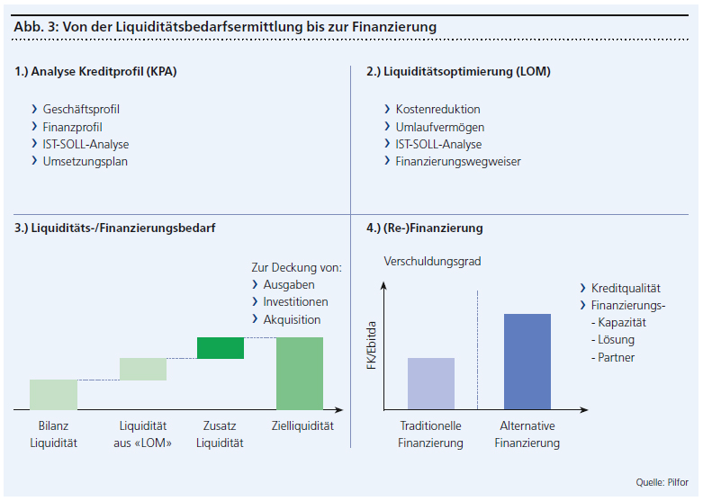 Jede gut geplante Massnahme für den Finanzierungszugang, die finanzielle Flexibilität sowie optimierte Finanzierungskosten ist nur so viel wert wie ihre umfassende und konsequente Umsetzung (siehe Abbildung 3). Hierfür entscheidend sind die notwendige Erfahrung, die fundierte Kenntnis aller infrage kommenden Finanzierungslösungen sowie ein funktionierendes und breites Netzwerk mit deren wichtigsten Anbietern bei gleichzeitig strikter Unabhängigkeit im Interesse des KMU. Unter diesen Voraussetzungen lässt sich ein erheblicher und oft zentraler Unternehmenswert bei vergleichsweise geringem Aufwand schaffen.