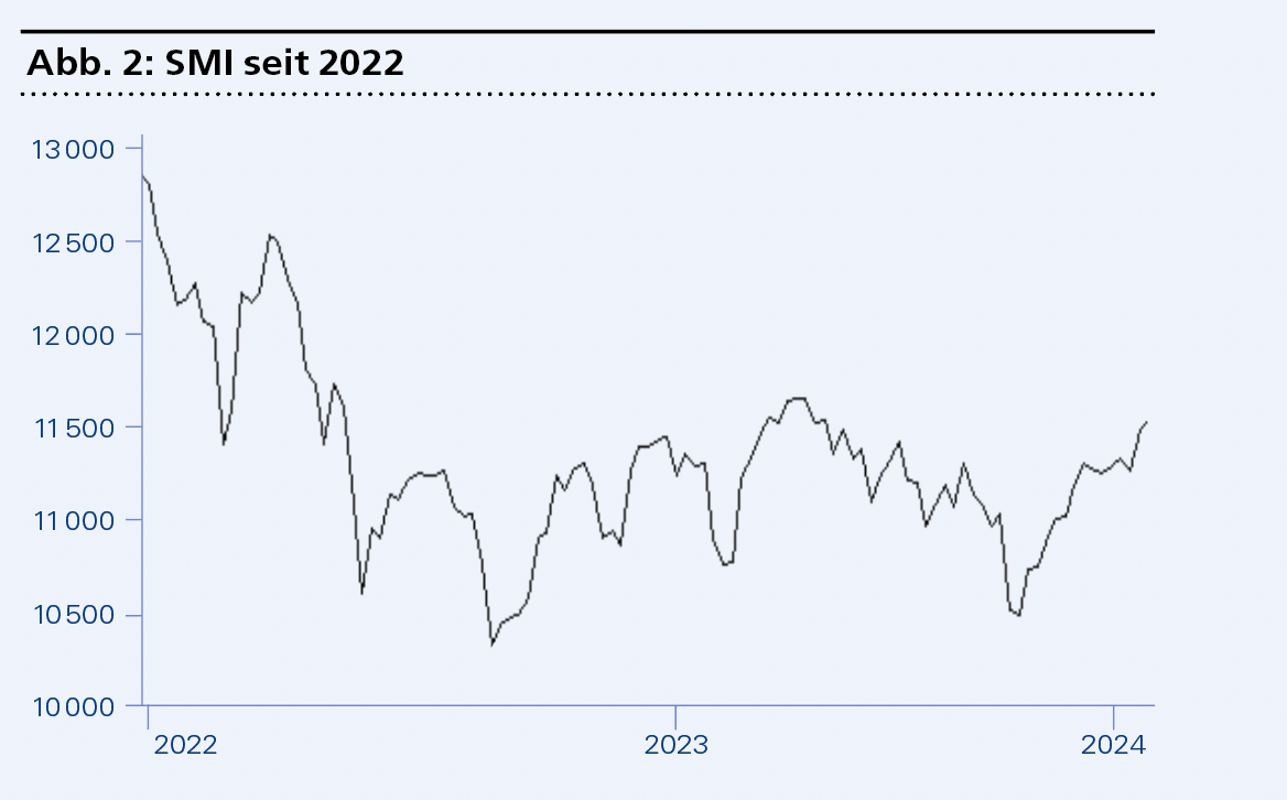 Sinkende Zinsen sind gut für Aktien, steigende Zinsen schlecht. So steht es in den Lehrbüchern. Zwar hat es zuletzt wieder einen leichten Anstieg der Obligationen gegeben. Aber die Renditen vom Jahresanfang 2023 werden wohl nicht mehr erreicht werden. Damit fallen die Bundesobligationen als Konkurrenz für den Aktienmarkt aus. Denn bereits die Dividendenrenditen der wichtigsten 64 Aktien in der Schweiz liegen mit durchschnittlich 2,6 Prozent eindeutig höher.