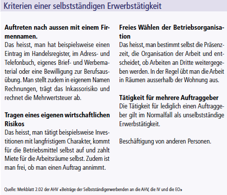 Der Entscheid, ob eine selbstständige oder eine unselbstständige Erwerbstätigkeit vorliegt, fällen die Ausgleichskassen bzw. die SUVA unter Würdigung der gesamten Umstände eines Einzelfalls. In der Regel liegen sowohl Elemente einer selbstständigen Erwerbstätigkeit wie auch eines Arbeitsverhältnisses vor. Die Ausgleichskassen und die SUVA gewichten dann, welche Merkmale im konkreten Fall überwiegen. Sie gehen dabei von den tatsächlichen wirtschaftlichen Verhältnissen aus. So ist beispielsweise egal, ob die Parteien ihren Vertrag mit «Auftrag» betiteln, wenn dieser starke Elemente eines Arbeitsvertrages beinhaltet.