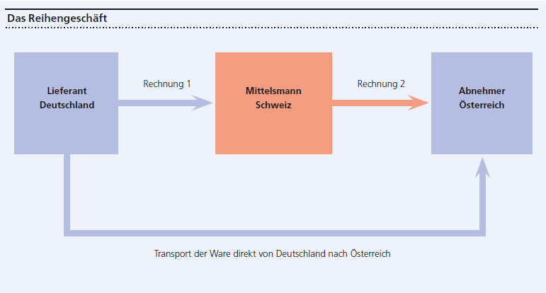 In diesem Beispiel bleiben die Sessel immer in Deutschland, obwohl die erste Rechnung an die Meier AG und damit in die Schweiz gestellt wird, und die Meier AG aus der Schweiz heraus an ihren Kunden fakturiert. Da aber die Sessel Deutschland nicht verlassen, unterliegen alle Verkäufe der deutschen Mehrwertsteuer. Der Schweizer Mittelsmann Meier AG muss sich somit in Deutschland für Zwecke der Umsatzsteuer erfassen lassen.