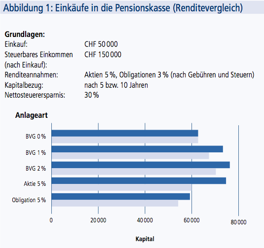 Doch wie attraktiv sind Einkäufe renditemässig im Vergleich mit anderen Anlagen? Wenn die Rendite eines Einkaufs mit der Rendite von Obligationen und Aktien verglichen wird, ist das Ergebnis erstaunlich: Wird bei einem BVG-Einkauf die Steuerersparnis und eine Verzinsung von zwei Prozent zum eingesetzten Kapital dazugezählt, so schafft es eine Aktienanlage mit einer jährlichen Rendite von fünf Prozent innerhalb von zehn Jahren unter Umständen nicht, ein höheres Kapital als bei einem Einkauf zu generieren. Eine Obligation mit einer Rendite von drei Prozent erzielt in fünf oder auch zehn Jahren in der Regel weniger Kapital als ein BVG-Einkauf (vgl. Abbildung 1).