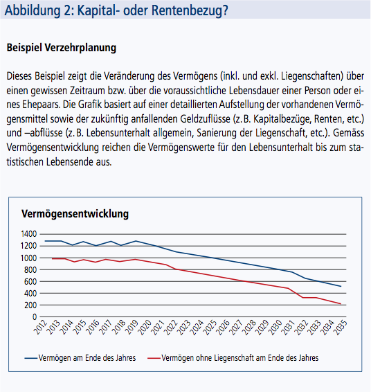 Die sich daraus ergebenden Vermögenszu- oder -abflüsse können mit den vorhandenen Vermögenswerten kombiniert werden. Eine Vermögensentwicklung lässt sich somit antizipieren und auch grafisch darstellen, was gewisse Entscheidungsfindungen (z. B. geplante Schenkungen, Anschaffungen, Liegenschaftsunterhalt usw.) vereinfacht (vgl. Abbildung 2).