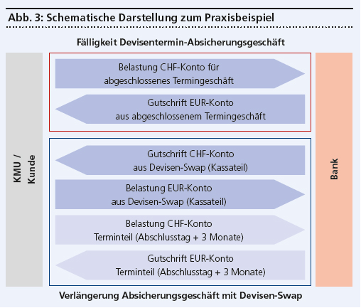 Da mit dem Schweizer Grosskunden «Zahlung bei Lieferung» vereinbart wurde, fehlt die nötige Liquidität, um den Euro-Kauf zu bezahlen. Genau jetzt empfiehlt sich ein Devisen-Swap: Das Schweizer KMU verkauft die aktuell nicht benötigten Euros und kauft sie auf den neuen Termin in drei Monaten. Somit wurde das bereits getätigte Absicherungsgeschäft via Swap um drei Monate verlängert und das Währungsrisiko wieder abgesichert.