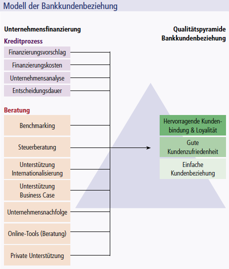 Die Qualitätspyramide Bankkundenbeziehung (rechter Teil der Grafik) erklärt die Zufriedenheit, also ob es sich um einen Kunden mit vagen Erwartungen (Level Kundenbeziehung), um einen zufriedenen Kunden (Level Kundenbeziehung) oder gar um einen Kunden mit einer ausdrücklichen Präferenz (Level Loyalität) handelt. Das zweite Element des Modells ist die Aufteilung der Unternehmensfinanzierung in ihre Bestandteile (linker Teil der Grafik), und zwar in die elf Einzelthemen. Vier Einzelthemen werden in den Bereich Themenzufriedenheit Kreditprozess gruppiert. Sie sind die Kernthemen bei Unternehmensfinanzierungen: