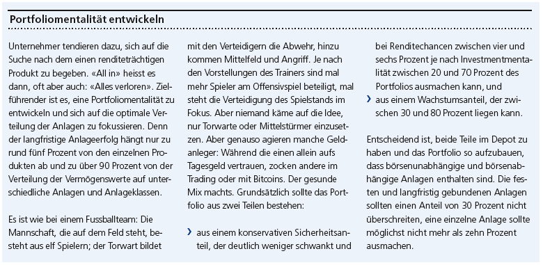Nehmen wir als Beispiel die Unternehmerin Alex Müller. Zunächst einmal kümmert sie sich um die Ebene des Schutzes. Sie spart eine Geldsumme an, mit der sie ihre privaten Mindestkosten bestreiten kann, und zwar für mindestens sechs Monate. Bei 4000 CHF Ausgaben im Monat sollte sie mindestens 24 000 CHF zur Verfügung haben. Das sorgt für ruhigen Schlaf und gibt die Kraft, um unternehmerische Herausforderungen zu stemmen. Dazu prüft sie kritisch, welche Ausgaben unbedingt nötig sind, und sichert diese ab. Dabei zeigt sich: Nicht die Höhe des Einkommens ermöglicht es, Wohlstand aufzubauen, sondern die Fähigkeit, zu sparen. Und diese Fähigkeit lässt sich erlernen und trainieren, indem sie die Disziplin aufbringt, ihre Ausgaben zu überwachen und übrig gebliebenes Geld in kleinen Schritten zu investieren. Die Grundüberlegung auf der Ebene der finanziellen Sicherheit ist: Die Unternehmerin baut so viel Kapital auf, dass sie ihre monatlichen Mindestkosten aus den Renditen ihrer Investments bestreiten kann, ohne diese zu verzehren. Das heisst: Solange sie arbeiten muss, um diese zu bestreiten, ist sie eine «Geldproduktionsmaschine». In dem Moment, in dem sie ihre monatlichen Mindestkosten aus den Gewinnen ihres Kapitals bestreiten kann, verfügt sie über eine Geldproduktionsmaschine – und hat die Ebene der Sicherheit erreicht.