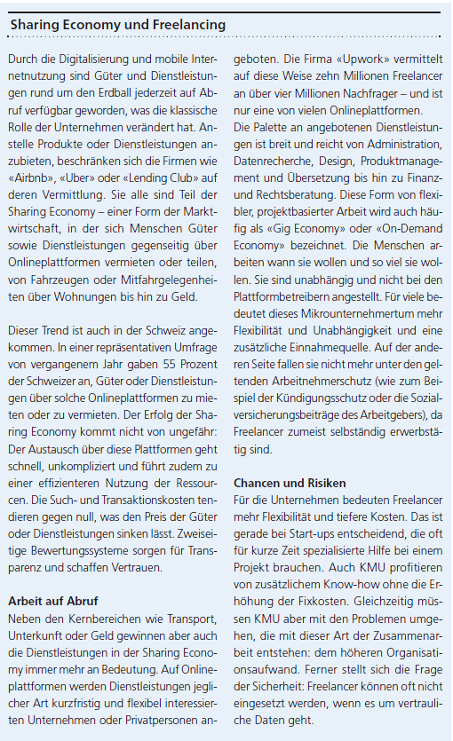 Neben dem Home-Office ist dank der Sharing Economy in den letzten Jahren eine weitere Alternative zum konventionellen Büro des Arbeitgebers entstanden: sogenannte Third Places. Onlineplattformen führen hier Anbieter und Nachfrager von Büroräumlichkeiten und Arbeitsplätzen auf der ganzen Welt rasch zusammen – ganz nach dem Modell des Community-Marktplatzes «Airbnb». Wer kurzfristig einen Arbeitsplatz benötigt, findet ihn per Mausklick. Das flexible Mieten und Vermieten von Büros boomt – Betreiber solcher Plattformen wie «Liquid Space» oder «Share Desk» gehören zu den aufstrebenden Sharing Economy Start-ups aus dem Silicon Valley.