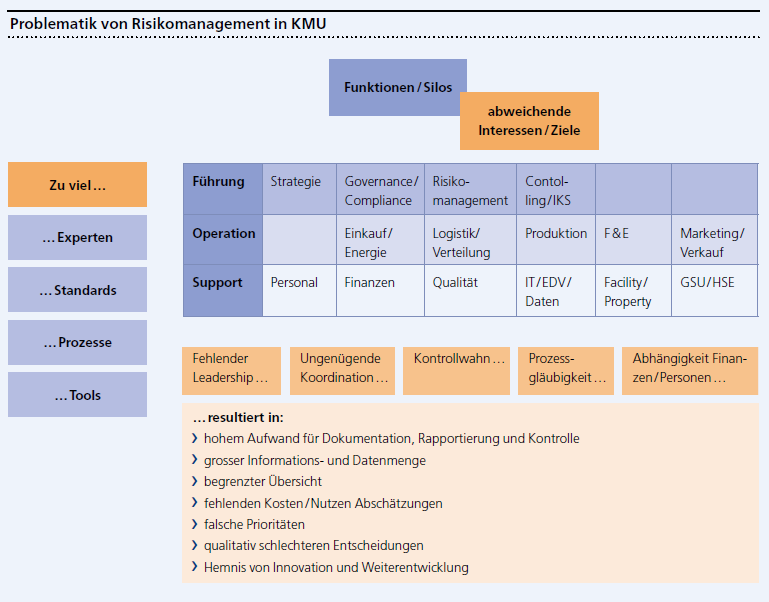 Diverse weltweite und gross angelegte Studien der Big 4 unter den Wirtschaftsprüfern, unter anderem der Deloitte und PricewaterhouseCoopers (PwC), aber auch von Versicherungen zeigen, dass eine deutliche Mehrheit der befragten Manager Risikomanagement als wichtig bezeichnen. Zudem wollen fast alle zukünftig in die Optimierung des Risikomanagements investieren. Interessanterweise bezieht jedoch nur noch etwa ein Drittel der Manager konkrete Informationen des Risikomanagements in ihre Entscheide ein. Sie entscheiden nach wie vor aus dem Bauch heraus. Was sind denn nun die hauptsächlichen Probleme, die ein KMU davon abhalten, ein Risikomanagement optimal zu nutzen?
