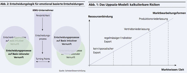 Eine rationale und explizite Nutzung von Emotion und Intuition als Entscheidungsbasis und damit Unsicherheitsreduktion wird insbesondere für KMU zur «Ultima Ratio» (siehe Abbildung 2, rechte Seite des Modells). Der Unternehmer als Internationalisierungsentscheider muss demzufolge entscheiden, wann und in welchem Umfang er seiner Emotion und Intuition Raum gibt und Vertrauen schenkt. Diese Entscheidung wiederum kann auf rationalen Argumenten beruhen und demzufolge reflektiert und erfahrbar werden. Die in Abbildung 2 visualisierte Entscheidungslogik, zeigt den Balanceakt zwischen Rationalität und Bauchgefühl, den es bewusst einzusetzen gilt, um emotional basierte Entscheidungen produzieren zu können.