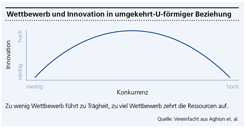 Ihre zentrale Erkenntnis: Am innovativsten sind Märkte, in denen es weder nur träge Monopole noch einen unerbittlichen Wettbewerb gibt. Zu viel Wettbewerb nur über die Kosten könne dazu führen, dass Unternehmen in einem steten Überlebenskampf steckten. Wer in einem scharfen Preiskampf stehe, könne kaum Reserven aufbauen, die für riskante Forschung und Entwicklung notwendig wären. Zu wenig Wettbewerb hingegen würde träge machen. Wer als Monopolist fest im Sattel sitze, verspüre keinen Drang, das Neue zu wagen.