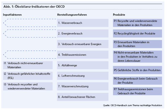 Zunächst sind alle Abläufe im Unternehmen dahingehend zu prüfen, welche Auswirkungen (Impacts) sie in einem der drei Bereiche E, S und G auf bestimmte Stakeholder oder die Gesellschaft als Ganzes haben. Dies sollte in umfassender Weise entlang der gesamten Wertschöpfungskette geschehen. Ist eine Prozesslandkarte des Unternehmens vorhanden, kann diese als Ausgangsbasis verwendet werden. Produzierende Unternehmen können sich zudem an den von der OECD herausgegebenen Ökobilanzindikatoren orientieren, die für die drei Bereiche Inputfaktoren, Prozesse und Output Kenngrössen definiert.