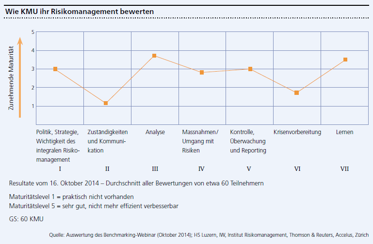Viele Verwaltungsräte und Geschäftsleitungsmitglieder von kleinen und mittleren Unternehmen befassen sich mit der Frage, ob ein Risikomanagement über die gesetzlichen Anforderungen hinaus einen Nutzen für das Unternehmen bringt und wie es effizient umgesetzt werden kann. Mit diesem Thema hat sich daher die Hochschule Luzern (HSLU) in der Abteilung Wirtschaft und dem Institut Risikomanagement im Rahmen einer KPI-Forschungsstudie vertieft auseinandergesetzt. Unter der Leitung von Prof. Jens Meissner wurden eine Arbeitsgruppe mit erfahrenen Risikomanagern gebildet und in diversen Workshops die wesentlichen Merkmale eines Risikomanagements spezifisch für KMU herausgearbeitet. Als erste daraus folgende Massnahmen schaltete die Gruppe eine Internetseite auf, die über die Homepage der HSLU für jedermann zugänglich ist. Neben Checklisten zu Risikothemen, wie Business Continuity und Risk Reporting, sind dort Compliance-Informationen sowie ein Link auf ein Benchmark-Tool zu finden. Mit diesem Tool können Unternehmen durch Beantwortung einfacher Fragen ihre aktuelle Situation bezüglich Risikomanagement evaluieren und gegebenenfalls Schwächen erkennen. Es erlaubt zudem einen anonymen Benchmark mit dem Durchschnitt aller bereits eingegebenen Selbstbewertungen. Das Resultat wird in fünf Maturitätsstufen angegeben – von Maturitätslevel 1 (praktisch nicht vorhanden) bis 5 (sehr gut und nicht mehr effizient verbesserbar).
