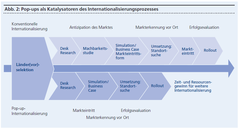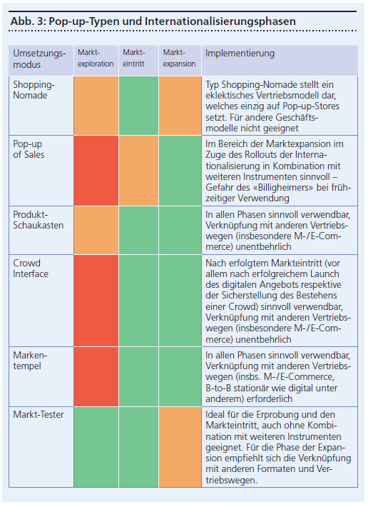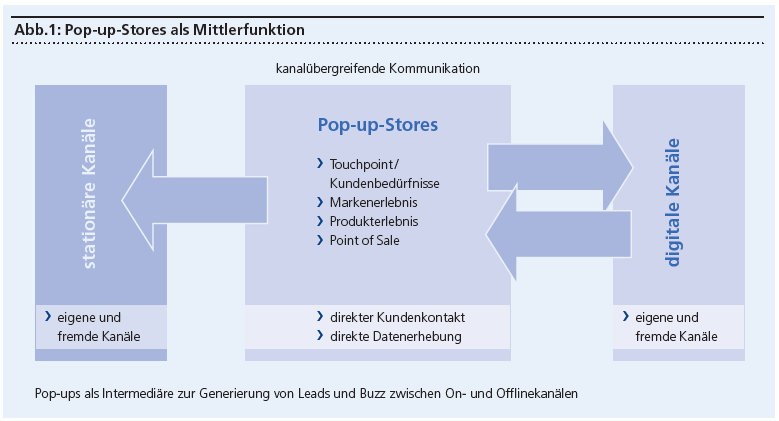 Die sogenannten Pop-up-Stores erscheinen für die Kunden plötzlich und schliessen bereits nach kurzer Zeit wieder: Der Überraschungseffekt bei der Eröffnung schafft Aufmerksamkeit und der Verknappungseffekt («limited edition», «nur für kurze Zeit») generiert einen Nachfragesog. Die kurzen Mietzeiten in Kombination mit einem eingeschränkten Angebot ermöglichen mit einer geringen Kapitalbindung das Ausprobieren von Neuartigem im direkten Kundenkontakt oder den Abverkauf von Saison- sowie Restware, ohne die Marke in Richtung «billig» zu belasten. Weiteres Potenzial ergibt sich durch die vorübergehende Marktpräsenz in Form von Pop-up-Niederlassungen beziehungsweise -Offices vor allem im B-to-B-Bereich.