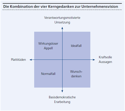 Löbliche Absichten kundtun: Visionen wie «Die beste Leistung – für Kunden, Kaufleute, Mitarbeiter» (Rewe) drücken zwar gute Absichten aus, bieten jedoch kaum Orientierung für das Alltagshandeln des Unternehmens. Solche Aussagen können dennoch relevant und sinnstiftend sein, wenn sie einen deutlichen Wandel in der grundsätzlichen Ausrichtung des Unternehmens einleiten, zum Beispiel weg von der reinen profitmaximierenden Shareholder- zu einer umfassenden Stakeholder-Orientierung.