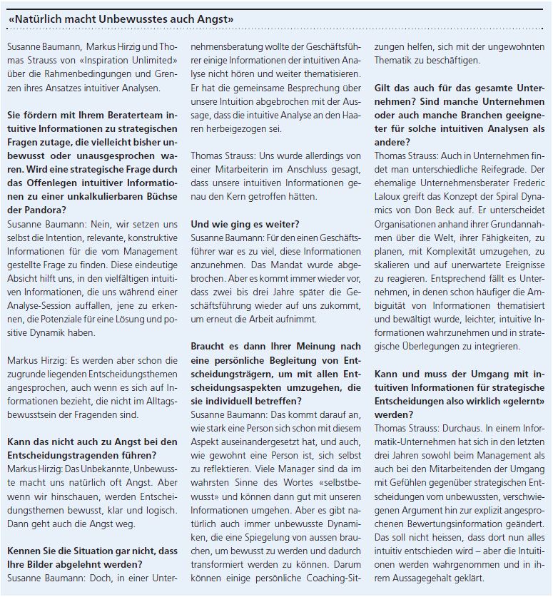 Ein Praxisbeispiel dazu: Eine grosse Metzgereikette hat über sieben Jahre insgesamt vier Entscheidungsvorlagen zurückgewiesen, ein vegetarisches Catering als neues Geschäftsfeld aufzubauen. Obwohl leitende Angestellte und Vertreter der Geschäftsleitung sich sicher waren, dass der Bereich sich bezahlt machen würde, führte der analytische Entscheidungsfindungsprozess immer wieder zum Aus. Die übliche Rentabilitätsrechnung, die für alle Tochterunternehmen und Hierarchieebenen bindend war, wies das neue Geschäftsfeld als zu unsicher aus. Schliesslich empfahl ein Strategie-berater: «Versuchen Sie nicht mehr, das Geschäft analytisch zu rechtfertigen, sondern vertrauen Sie Ihrem Glauben und Ihrer Lust daran und machen Sie vorwärts.» Drei Jahre später war vegetarisches Catering eines der renditestärksten Standbeine. In diesem Beispiel ist Intuition also das sichere Gefühl, dass vegetarisches Catering rentabel sei, jenseits der analytischen Rentabilitätsrechnung.