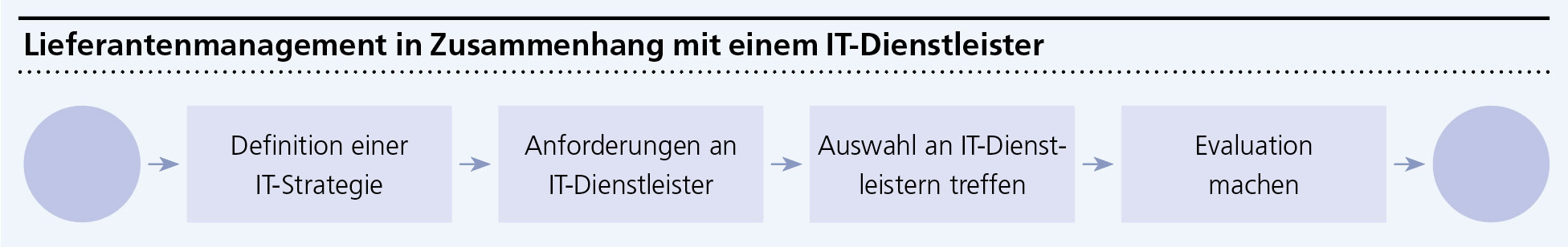 Der erste Schritt zur Risikominimierung ist die Erarbeitung einer IT-Strategie für das Unternehmen. Diese Strategie definiert wichtige Eckpunkte der IT-Umgebung und legt fest, wie IT-Prozesse die Unternehmensziele unterstützen sollen. Anschliessend sollte eine systematische Auseinandersetzung mit potenziellen Dienstleistern und deren Anforderungen erfolgen.