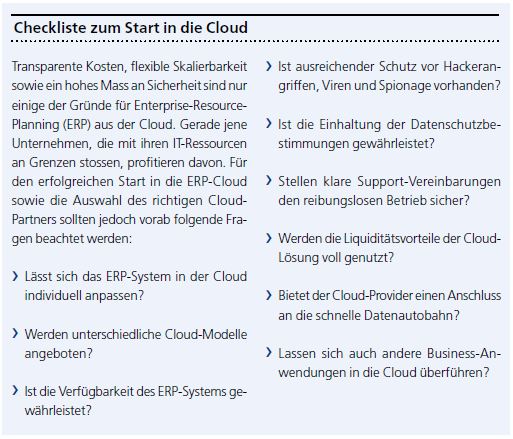 Wer zum Beispiel gerade erst ein modernes Rechenzentrum aufgebaut und Kernanwendungen neu aufgesetzt hat oder über eine personell starke IT-Abteilung verfügt, wird eher nicht über einen kurzfristigen Wechsel in die Cloud nachdenken. Dagegen ist eine Cloud-Lösung besonders interessant, wenn das Unternehmen ohnehin ein neues ERP-System plant, nur wenige eigene IT-Fachkräfte hat oder das Rechenzentrum grundlegend erneuern und ausbauen muss. Eine sinnvolle Alternative zum Eigenbetrieb kann eine vollständige Nutzung von ERP aus der Cloud auch für schnell wachsende Unternehmen sein, die nur über geringe IT-Ressourcen verfügen. Sie können damit schnell neue Benutzerkonten zu fest kalkulierbaren Kosten einrichten. Dies ermöglicht die Konzentration auf die Weiterentwicklung von Produkten und Services.
