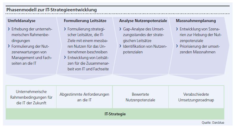 In der Beratungspraxis haben sich zwei wesentliche Erfolgsfaktoren für die IT-Strategieentwicklung herauskristallisiert: Die IT-Strategie muss gemeinsam von Management, Fachabteilungen und der IT entwickelt sowie getragen werden. Durch die gemeinsame Formulierung strategischer Leitsätze werden Verständlichkeit, Verbindlichkeit und Fokussierung gewährleistet. Konkret lässt sich das Vorgehen für das Aufsetzen der IT-Strategie in vier Phasen unterteilen (siehe Abbildung).