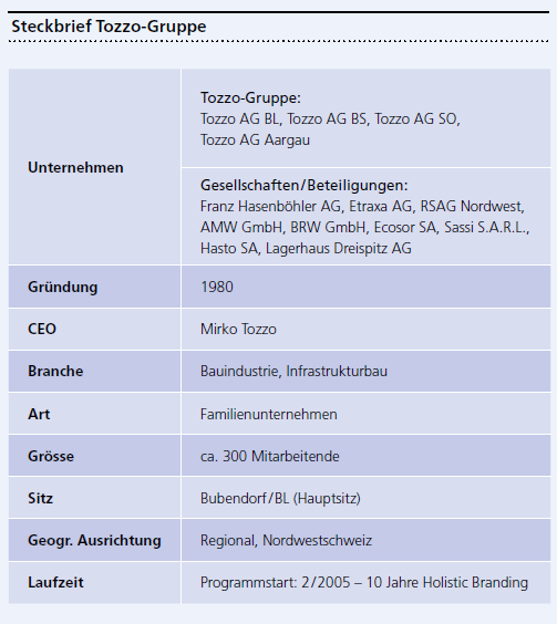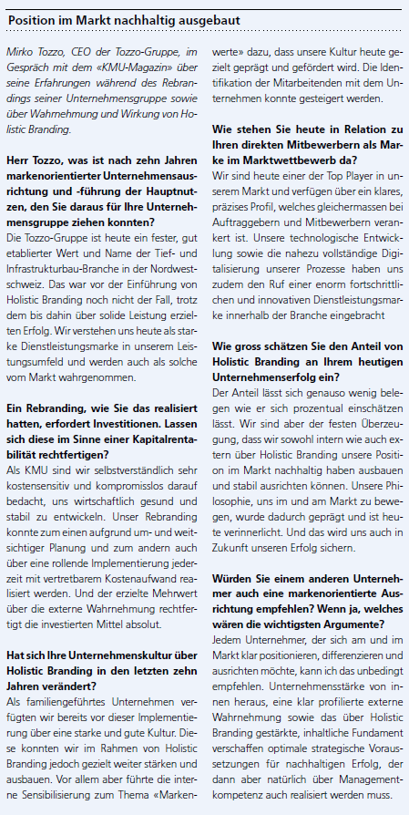 Heute, rund zehn Jahre nach der Ein-führung von Holistic Branding bei der Tozzo-Gruppe, kann das Management auf ein ansehnliches Ergebnis zurückblicken. Die Unternehmensgruppe konnte in dieser Zeit ihre Grösse verdoppeln, ist heute unter den direkten Mitbewerbern einer der fortschrittlichsten Player, hat sich sowohl als Leistungspartner wie auch als Arbeitgeber eine attraktive Position erarbeitet und ist wirtschaftlich gesund und solide vernetzt im Markt etabliert. Diesem Resultat zugrunde liegt natürlich in allererster Linie eine herausragende Managementleistung, welche durch das Team rund um die drei Brüder Tozzo gemeinsam erzielt wurde. Die Verinnerlichung von Holistic Branding in der Tozzo-Gruppe hat diese Leistung jedoch zusätzlich verstärken und insbesondere die interne und externe Wahrnehmung nachhaltig und positiv prägen können.
