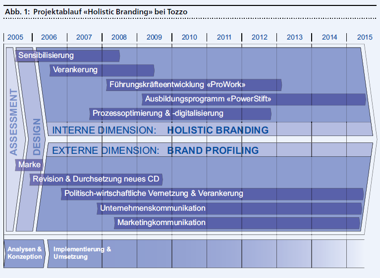 Wie bei jeder Einführung von Holistic Branding, so starteten wir auch bei Tozzo mit einer initialen Strategieklausur. Danach folgte die Analyse- und Assessment-Phase (siehe dazu die Abbildung 1), eine von Standortbestimmung, Auslegeordnung, Abgleichung der strategischen Erfolgsposition, Fokussierung und Priorisierung des Handlungsbedarfs sowie entsprechender Massnahmen geprägte, erste Projektetappe. Auf Basis des Grundkonzepts, dem ersten Etappenziel, folgte die «Design-Phase», in welcher die einzelnen Aktivitäten, Teilprojekte und die zeitliche Etappierung definiert wurden. Im Anschluss daran kam die schrittweise und kontinuierliche Umsetzung. Hier wurde zunächst die Marke «Tozzo» definiert. Damit wurde das Fundament des gesamten Projektes sowie des Programmes für die Zukunft gebildet. Bis heute wird dadurch der Rahmen für alle wahrnehmbaren Dimensionen des Unternehmens gegeben.