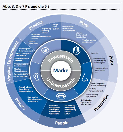 Rund um die Marke herum stehen die 7 P’s des heutigen Marketings: Product, Place, Price, Promotion, People, Processes und Physical Environment. Sie alle müssen in ihrer Ausgestaltung durch die Markendefinition geprägt werden. Berücksichtigt werden dabei die Wahrnehmungsmöglichkeiten über alle fünf Sinne, sowohl bewusst wie unbewusst. Die Marke steht jeweils im Zentrum (siehe Abbildung 3).