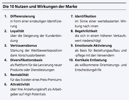Trennt man gedanklich die strategische Erfolgsposition als das Ziel und die Formulierung der Strategie im Sinne der Ausgestaltung des Weges zum Ziel voneinander, ist die Marke exakt dazwischen anzusiedeln. Nur dann kann sie die wert- und marktorientierten Leitplanken für alle strategischen und operativen Entscheidungen stellen. Und nur dann kann sie auf diese Weise das Wertvollste in der Marke herstellen: die Kontinuität. Denn in der Kontinuität liegt das Vertrauen des Marktes, liegen Orientierung, Identifikation und emotionale Bindung begründet.