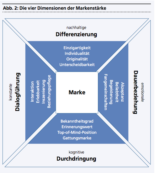 In Analogie zu den klassischen P’s des Marketing sprechen wir dabei von den vier D’s: Differenzierung, Dialogführung, Durchdringung und Dauerbeziehung. Die Gewichtung der einzelnen Dimensionen unterscheidet sich von Branche zu Branche und richtet sich zudem nach der jeweils individuell entwickelten Markenstrategie.