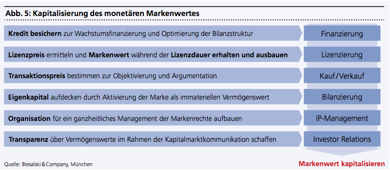 In der Tat gibt es aber auch Bewertungsunternehmen wie zum Beispiel die Biesalski & Company in München, deren Modelle und Methoden von führenden Finanzinstituten akzeptiert werden und sogar markenwertbasierte Unternehmensfinanzierungen zulassen (siehe Abbildung 5). Diese Bewertungen erhalten insbesondere dann hohe Relevanz, wenn ihr Wert kapitalisiert werden soll. Sei es wie eben erwähnt über Finanzierungen, sei es über Lizenzierungen oder eben auch im Rahmen von Verkäufen.
