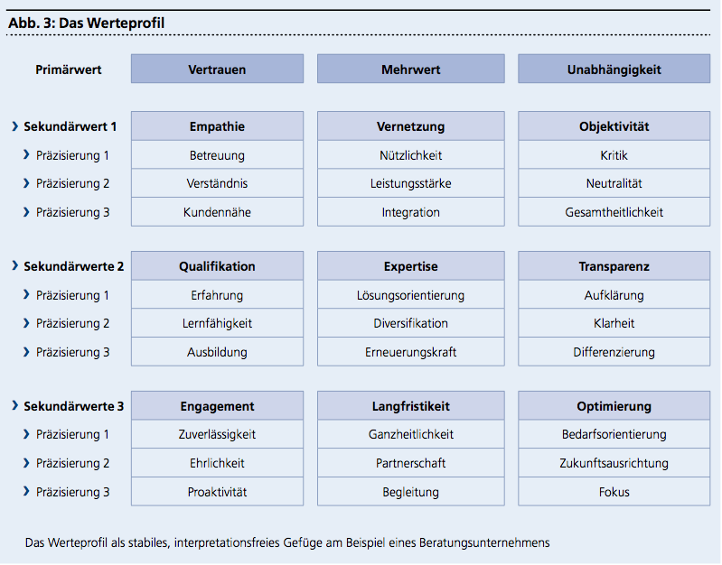 Um ein übereinstimmendes Verständnis sicherzustellen, wird jedem Primärwert über jeweils drei Sekundärwerte die richtige Konnotation verliehen. Auf der Mikroebene letztlich werden auch die Sekundärwerte in ihrer Aussage präzisiert, indem ihnen jeweils drei Attribute zugewiesen werden. Mit dieser Struktur erhält das Wertegefüge die benötigte Stabilität und Belastbarkeit, welche der Marke die inhaltliche Kontinuität garantiert.