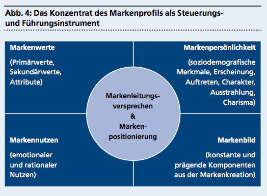 Die perfekteste Markendefinition ist wertlos, wenn sie nicht umgesetzt wird. Je umfangreicher sie ausfällt, desto schwerfälliger und unmöglicher wird ihre Implementierung. Auch hier gilt: In der Kürze liegt die Würze. In der Praxis hat es sich bei Holistic Branding bewährt, das Wesentliche des Markenprofils in einem einfachen Chart zusammenzufassen (siehe Abbildung 4).