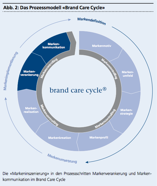 Doch mit nur einem entsprechend geschaffenen Markenerlebnis entsteht noch keine Markenstärke. Vielmehr muss die gesamte Marktpräsenz der Marke als eine vielschichtige, wiederholte Folge zahlreicher Erlebnisse konzipiert und über lange Distanz orchestriert werden. Zudem muss dies authentisch sowie einheitlich in Bezug auf Qualität und Werte erfolgen. Darin liegt die grosse Kunst erfolgreicher Markeninszenierung und -führung. Im Brand Care Cycle (P. D. Staub, m.a.d. brand care et al.) der Methodik für holistische Markenentwicklung und -führung wird Markeninszenierung in den Prozessschritten Markenverankerung und Markenkommunikation als Umsetzung der Markendefinition vorgenommen.