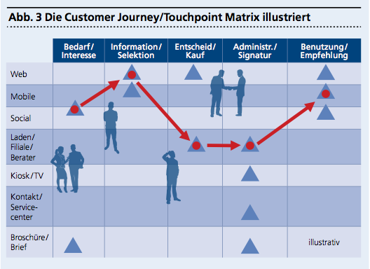 Für die wechselseitigen Übergänge von digitalen Medien (Informationsbeschaffung, Angebotsvergleiche) zu physischen Interaktionen (Verkaufsgeschäft, Schalter, Kundenservice-Center) ist ein nahtloses Ineinandergreifen der Angebote und Dienstleistungen über alle Kanäle sicherzustellen. Zu gross ist sonst die Gefahr, dass sich ein potenzieller Kunde frühzeitig verabschiedet.